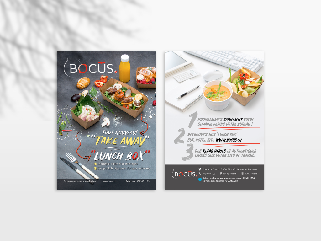 Création d'un Flyer pour l'entreprise "BOCUS" Flyer "Recto verso" Photoshop & Indesign Lausanne 2018 www.bocus.ch Entreprise de traiteur à Lausanne, Suisse